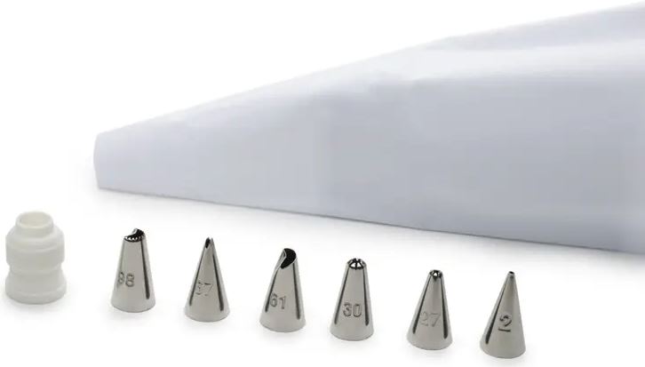 - The set includes one 10" reusable icing bag, one coupling, instructions and 6 metal tips all in a plastic storage container.