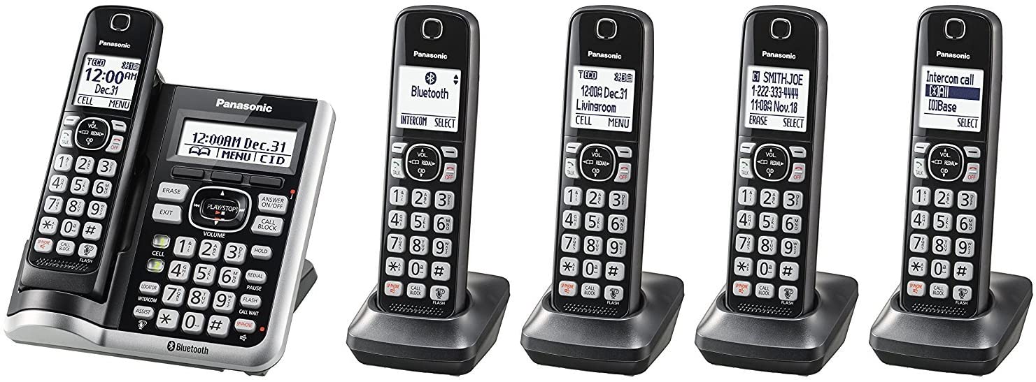 Panasonic KX-TG785SK Link2Cell Bluetooth Cordless Phone, Voice Assist and Answering Machine, 5 Handsets, Headphone Jack, Wall Mount, Belt clip 3,000 numbers