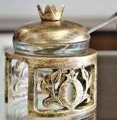 A&M Judaica Nua Brushed Gold Stainless Steel Pomegranate Shape Honey Dish on Stand with Spoon