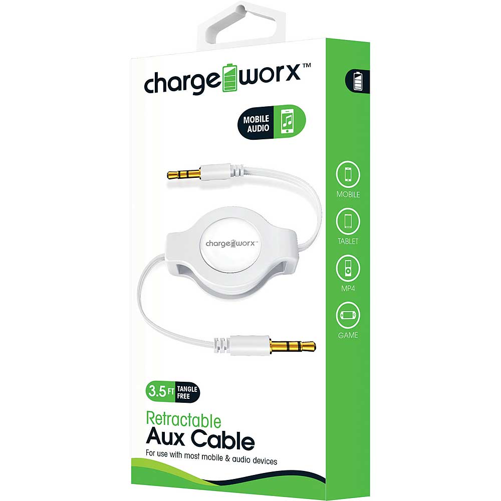 Chargeworx CX5512WH Aux Audio Retractable Cable, White