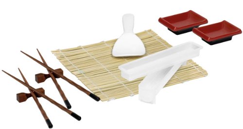 This is the complete starter set for sushi lovers. It includes a sushi rolling mat a three-step sushi maker a rice paddle two dipping sauce dishes two pair of chopsticks and two chopstick rests. The set also has complete instructions cooking tips and recipes.One bamboo sushi rolling mat & One bamboo sushi rice paddle One three-step sushi maker Two dipping sauce dishesTwo pair of chopsticks and chopstick rests Rolling mat is great for regular & inside-out sushi rolls Sushi maker is great for skinnier harder to roll sushi Mat paddle chopsticks rests are hand wash onlyThree-step sushi maker and sauce dishes are dishwasher-safeInstructions cooking tips and recipes included