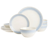 - The set includes four 11” dinner plates, four 8” dessert plates, and four 9” dinner bowls, each crafted from durable stoneware and finished with a reactive glaze and effortlessly attractive pale blue rim.
