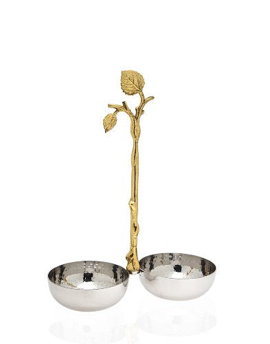 This stately 2-section relish dish with stainless steel and brass is a wonderful way to add style and a delicate style to your dining room décor. 2-section relish dish from the Leaf collection. Stainless steel and brass. Decorative leaf motif serves as handle. Pounded surface. Hand wash only. 10" high. 9" wide.