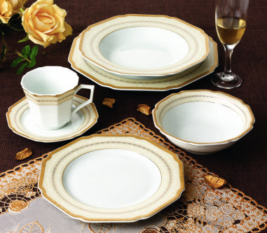 Golden Wavy Edged 57 Piece Fine Porcelain Dinnerware Set, Service for 8