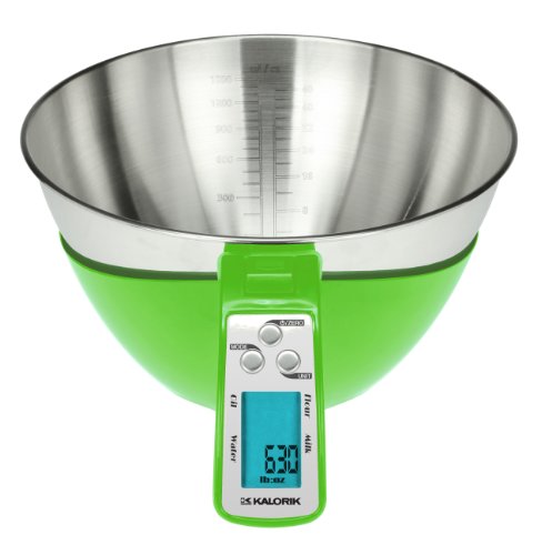 Take the guesswork out of new recipes with the Kalorik Electronic Measuring Cup Kitchen Scale. Items can be easily measured in volume or weight, by using one of five modes including grams/pounds, or one of the preset modes for milk, water, flour, or oil. The unit also features a handy tare function, which enables you to reset the scale to 0.0 when using an empty container or adding new ingredients! The hygienic and easy to wash stainless steel bowl allows you to measure all of your liquids without the messy clean up or build-up of bacteria. This scale is sure to add some flare to your kitchen with its stylish design, vibrant color and easy-to-read, backlit LCD display. Other features include an extra-large capacity of 1.5 quarts, auto shut-off and auto reset functions, and a conveniently large handle for easy pouring. 2 x 1.5V AAA batteries (not included).