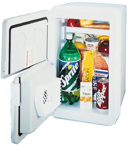 The Kargo Kooler is part of Koolatron's line of 12-volt coolers designed to plug into a car's cigarette lighter. Each cooler keeps your food cool without the use of ice. The really cool feature of the Kargo Kooler, though, is its versatility. With a compartmentalized interior and split lid/door, the unit looks more like a compact refrigerator than a cooler, with multiple stacking shelves and a top and bottom door. Even better, the split lid/door gives you access to the food inside even if the cooler is packed tightly in the trunk with a ton of luggage. The cooler's two dividers can be used in multiple positions--either as shelves (if the cooler is stored vertically, like a refrigerator), or as partitions (if it's stored horizontally, like a chest). To keep things cool, the 12-volt cooling system hums along on one side of the cooler, keeping the internal temperature 40 degrees F lower than the external temperature. Koolatron also sells a portable power pack that keeps the unit cool even when away from a vehicle. As an alternative, the cooler can also act as a warmer when you need to keep something heated. When sitting in chest position, the Kargo Kooler measures 20 by 14 by 16 inches (length by width by height). It holds up to 42 12-ounce soft-drink cans and weighs 14 pounds when empty. --Rivers Janssen