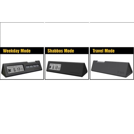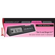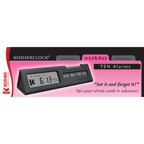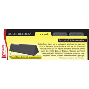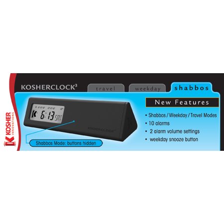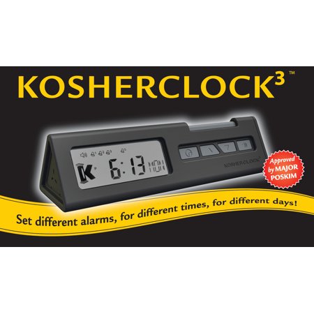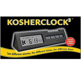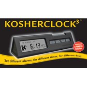 Kosher Clock 3!Set different alarms, for different times, for different days!KosherClock3 has a unique, innovative outer sleeve that can be rotated to give you 3 different modes: Shabbos Mode, Weekday Mode and Travel Mode.During the week, rotate the outer sleeve so you can see the screen and press all the buttons, including the Snooze button.Before Shabbos, orient the outer sleeve so you can only see the screen but cannot press any buttons. There is no problem with muktzah and the alarm shuts off automatically after one minute!To protect your KosherClock3 for travel, rotate the outer sleeve so the screen and buttons are covered.If you want your alarm to ring at the same time during the week, but not on the weekend, this is the perfect option for you! One example is if you want to wake up for work at 6 AM Monday - Friday.Instead of selecting a specific day of the week for your alarm to ring, choose "WDA" or Week Day Alarm. (Many people have a different wake up time for the weekend than during the week.)Another reason to use this alarm is if you need to be ready to pick up the children from school at the same time every day. This alarm can remind you of the time.TEN REASON YOU WANT THE KOSHER CLOCK 31.Ten alarms - enough for your busy schedule2.Set alarms for the time AND day you need3.Innovative outer case blocks buttons on Shabbos4.Alarms shut off automatically after 1 minute5.Easy to use - forward & reverse buttons6.Two volume settings for alarms (plus mute)7.Perfect size for Travel8.Week Day Alarm (won't ring on weekend)9.It's a great gadget for gift giving10.A good way to keep track of when to take pills or vitaminsWhat a fabulous gift idea, for Bar Mitzvah, Graduation, Birthday or especially for Grandparents living in another town.<br><br>