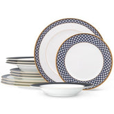 Noritake Blueshire 12 Piece Fine Bone China Dinnerware Set, Service for 4, Blue Mosaic Design with Gold Rim, Dishwasher Safe, Includes Dinner Plate, B&B and Soup Bowl