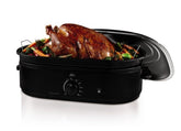 Roasts, bakes and slow cooks to perfection. This Oster 18-quart Roaster Oven is designed with a unique, self-basting lid to keep foods moist, nutritious and delicious. As a self-contained roaster, it uses the steam from cooking to lock in juices, so you can serve mouth-watering, flavorful meals to guests when entertaining. It also shortens cooking time and eliminates the need for constant hand basting. Ideal for preparing big holiday dinners with an 18-quart capacity to accommodate a turkey up to 22 lbs. Makes your kitchen more efficient too by freeing up oven space. Variable temperature control sets roaster to cooking temperature from 150oF to 450oF. Removable, enamel-on-steel roasting pan and roasting rack are included.