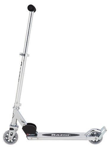 The Razor A2 is built of aircraft-grade aluminum, a sturdy material that holds up to use and abuse through the years. Razor combined the traditional aluminum construction, however, with a number of recent innovations, including a springless shock system that makes bumpy pavement feel smoother than ever and an all-new wheelie bar that guarantees an extra dollop of fun. Add in the foldable T-tube and deck, which tuck together to create a compact footprint (ideal for carrying when riding isn't appropriate), and you have a great kick scooter for virtually any situation. Other details include an enhanced finger guard, 98 mm inline-style wheels, and a patented rear fender brake for quick stops. This version of the Razor A2, which weighs around 6 pounds and supports up to 143 pounds, sports purple handlebars, a purple deck logo, and purple wheels and is recommended for ages 5 and older. It's also backed by a six-month warranty. For the next step up, try the Razor A3 Scooter. Key Features: The buyer and rider of the Razor A2 scooter are responsible for knowing and obeying all local, state, and federal regulations regarding the riding and use of scooters.