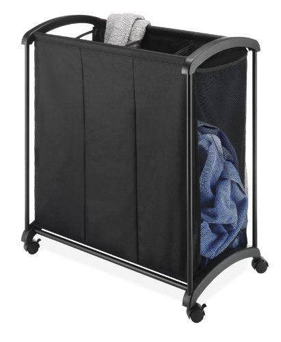 Whitmor's 3-Section Laundry Sorter in black has a durable plastic frame with metal side tubes. The 3 sorting sections are made with a fabric mesh, so clothing won't mildew. This sorter comes with four wheels and two of them lock holding the sorter in place. Perfect for laundry room or closet. Measures: 16.5"L x 28.5"W x 30.75"H.